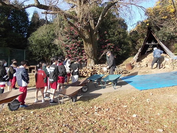 本日、5.6年生、先生および地域の方々総勢20名で今年度1回目の窯出しを行いました。続いて、地域3名で2回目の原木を投入し、火を入れました。